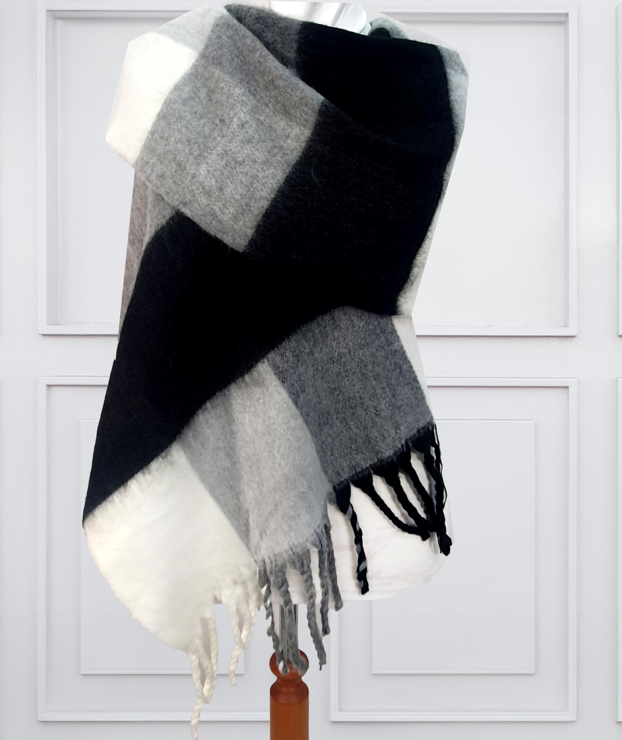 Teplá zimní šála zakončená třásněmi. Provedená z měkkého a příjemného materiálu.