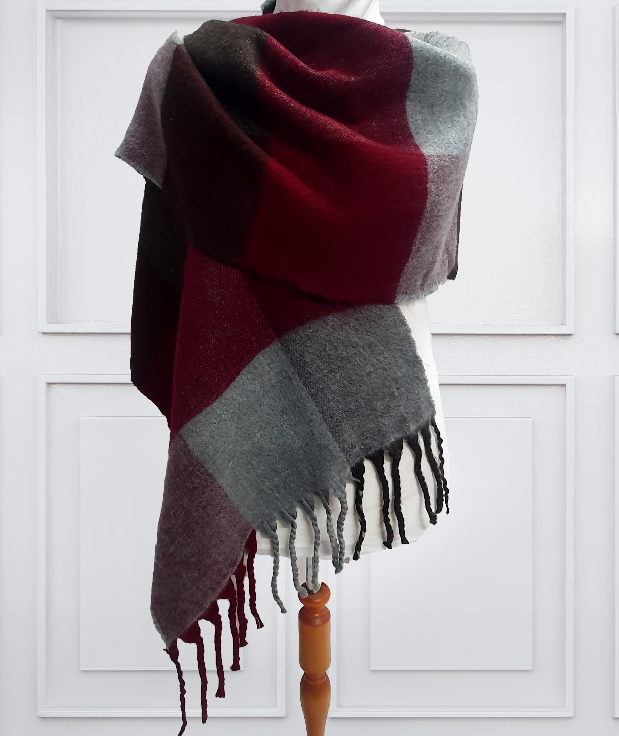 Teplá zimní šála zakončená třásněmi. Provedená z měkkého a příjemného materiálu.